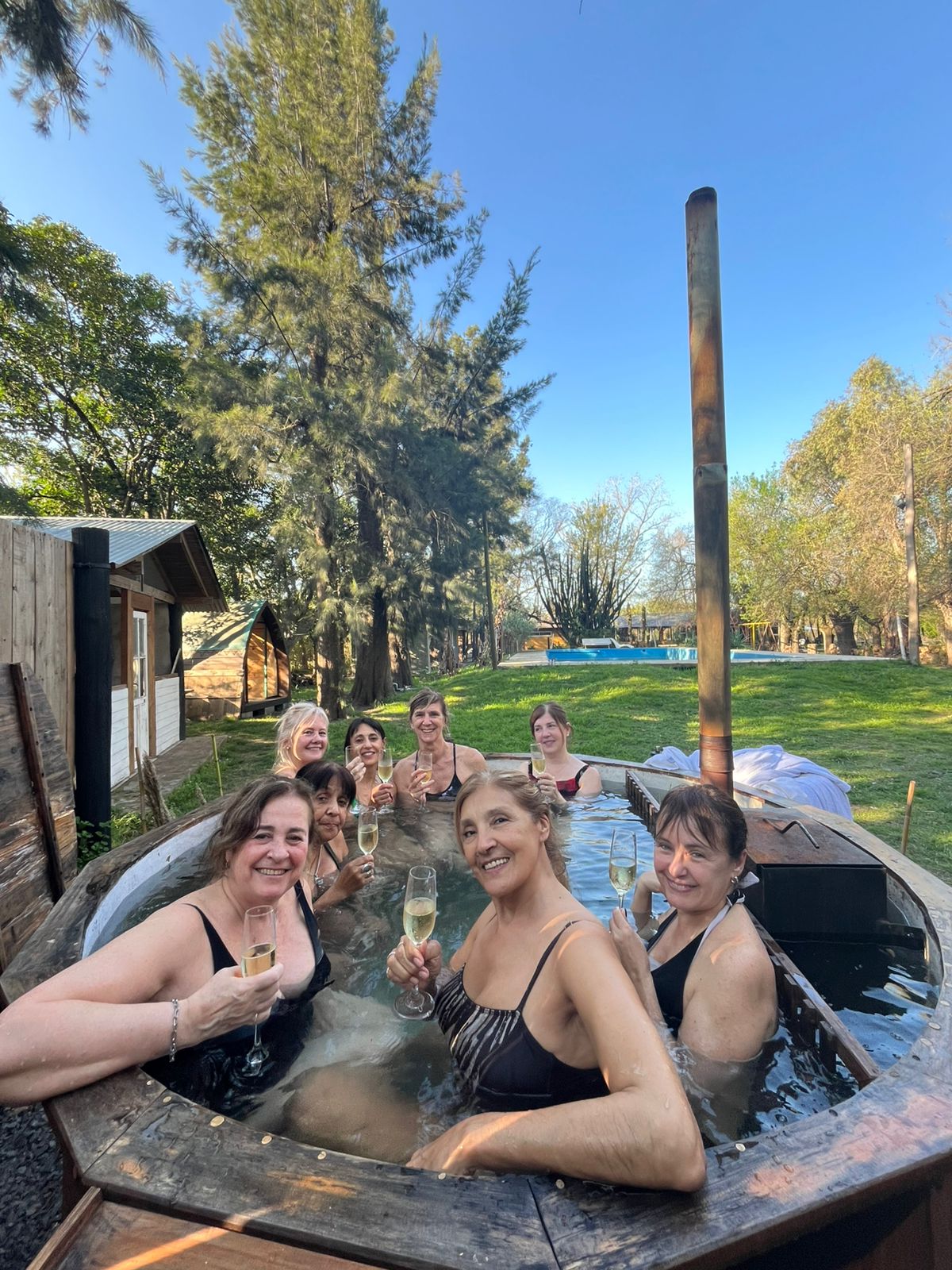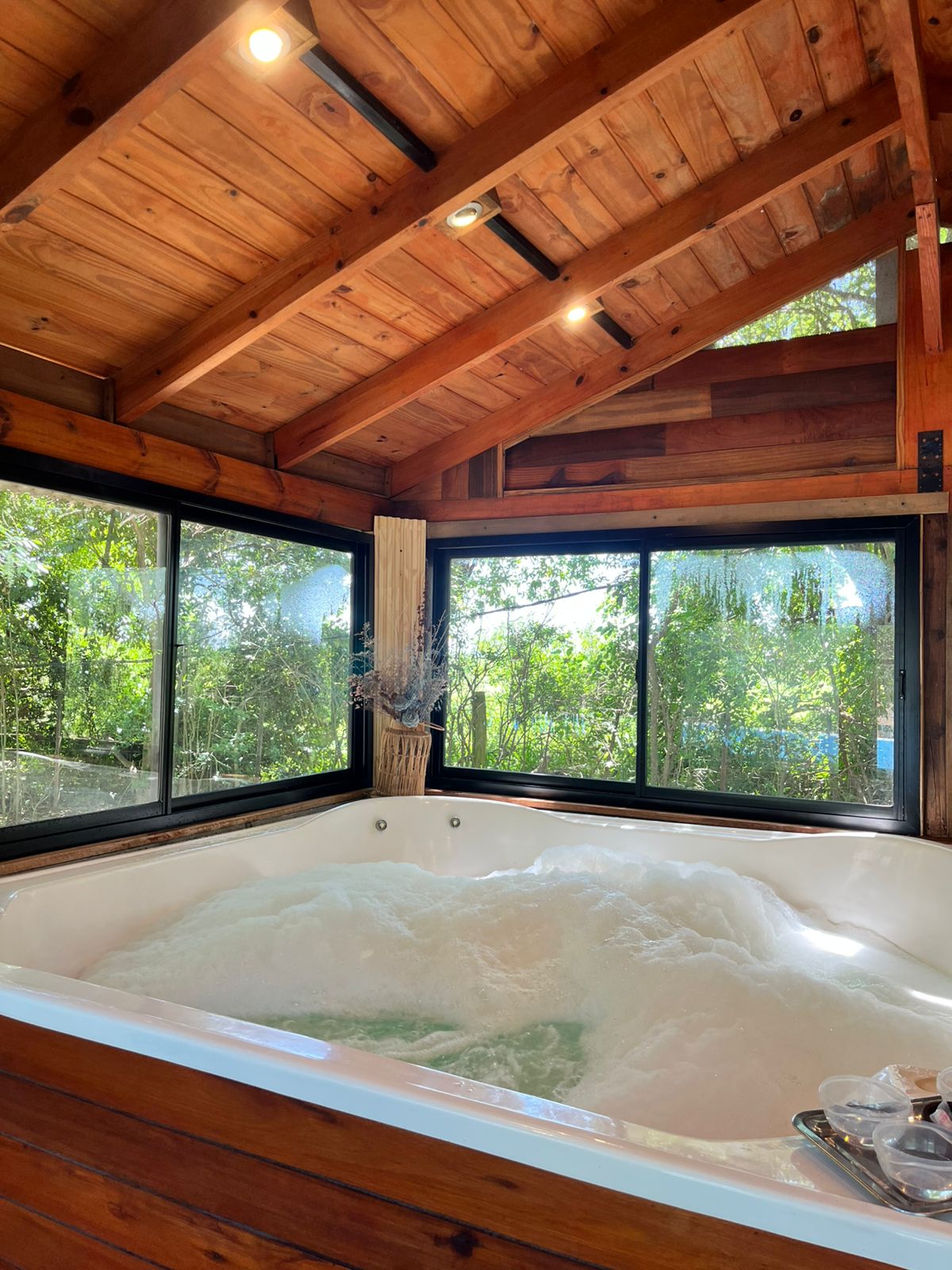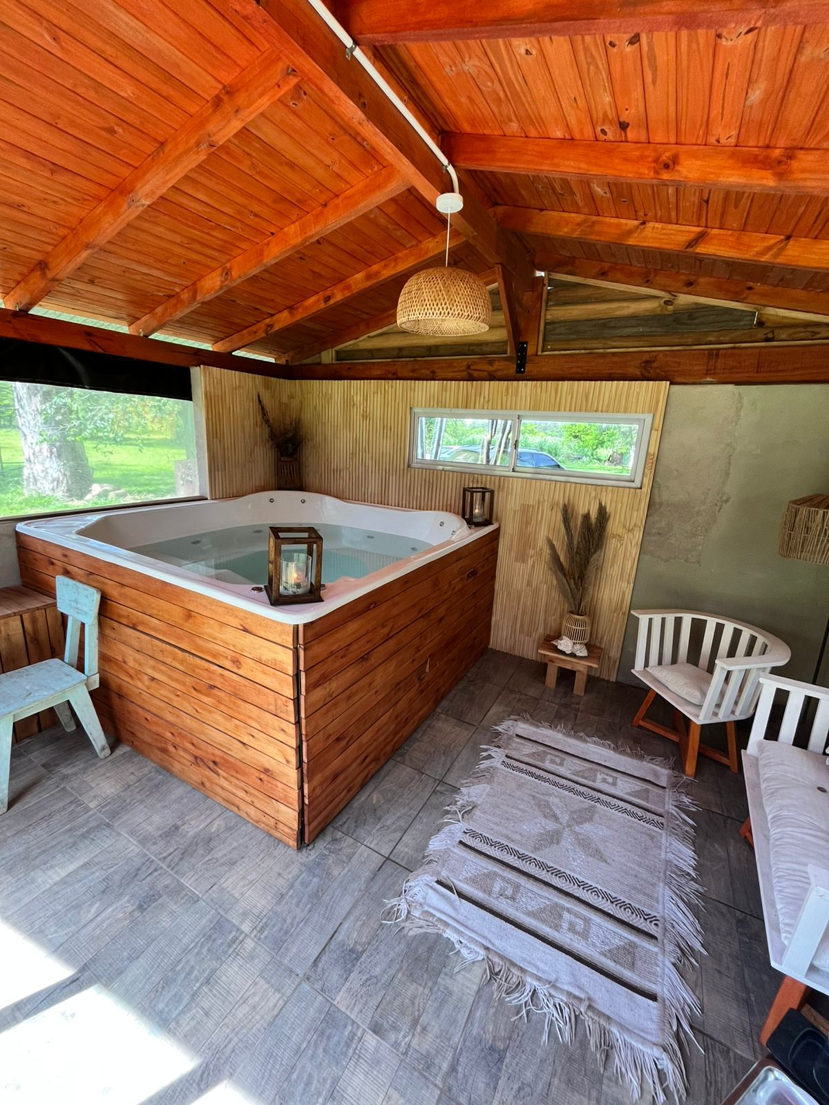 Jacuzzi climatizado ambientado con velas aromáticas, uso de batas y toallas + kit de spa, y tina finlandesa exterior ambientada